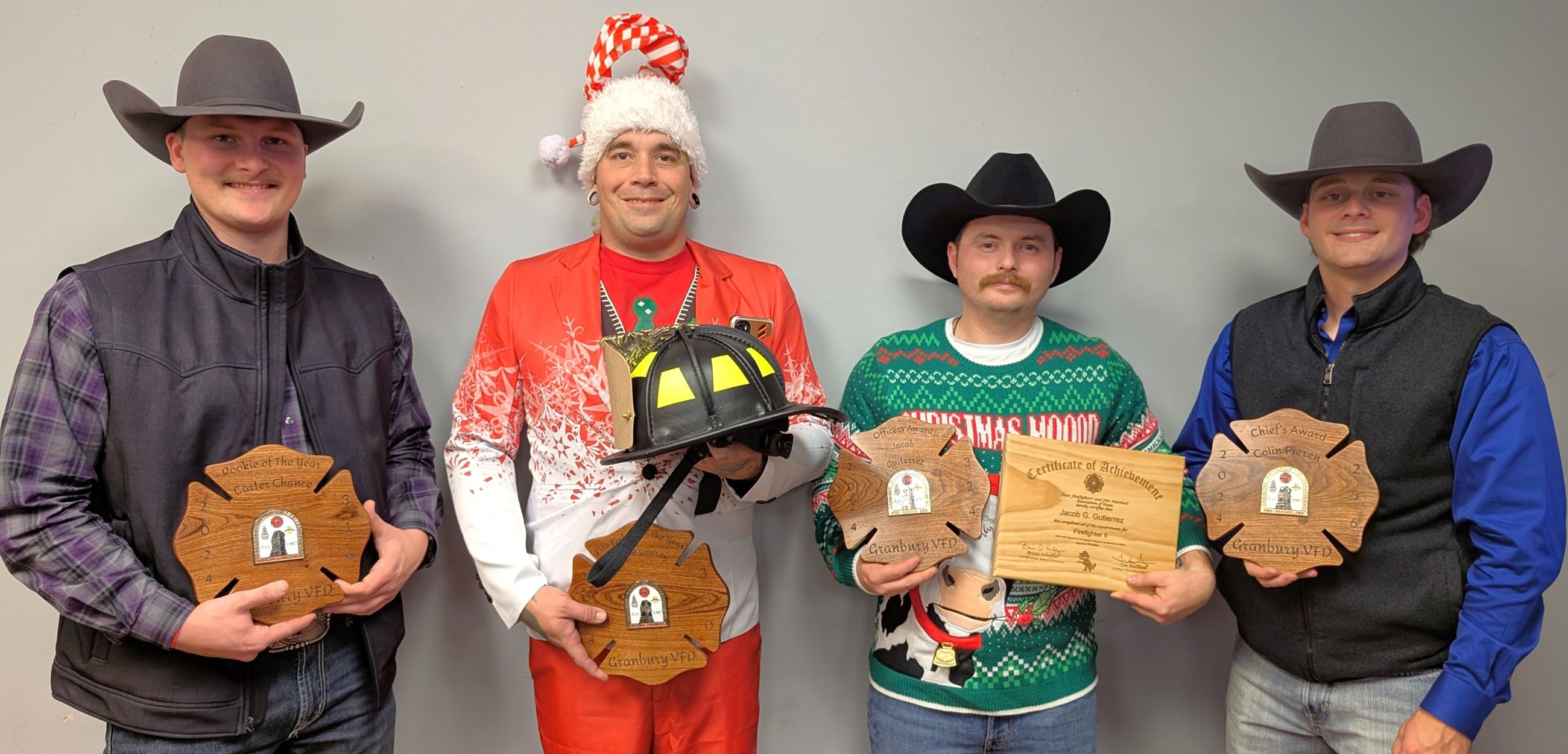 The City of Granbury congratulates four members of the Granbury Volunteer Fire Department for their outstanding contributions. (Pictured left to right) Carter Chance earned Rookie of the Year, an award voted on by the entire department. David Lowery was named Firefighter of the Year and received a traditional leather firefighter’s helmet. Jacob Guiterrez received the Officers Award, chosen by the Captains for his exemplary service and dedication. Colin Pieren was presented with the Chief’s Award in recognition of his commitment and promising future in the fire service.